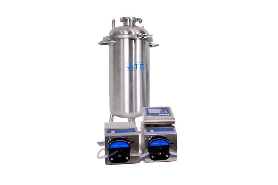 This peristaltic system employs a positive displacement pump that compresses the silicone product tubing, drawing the product through the dispensing nozzles for a steady flow. The pressure vessel generates back pressure, ensuring that no product is wasted.